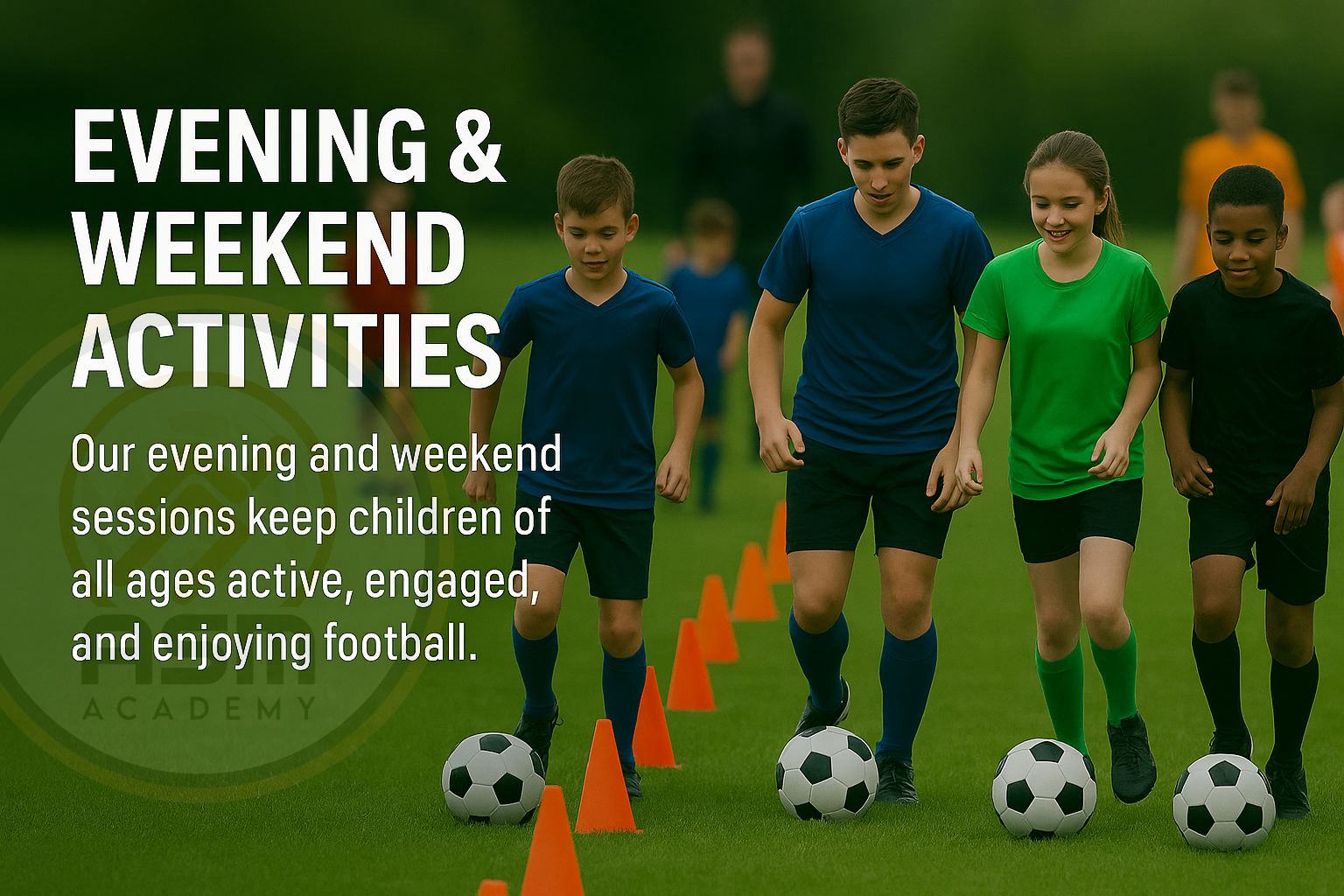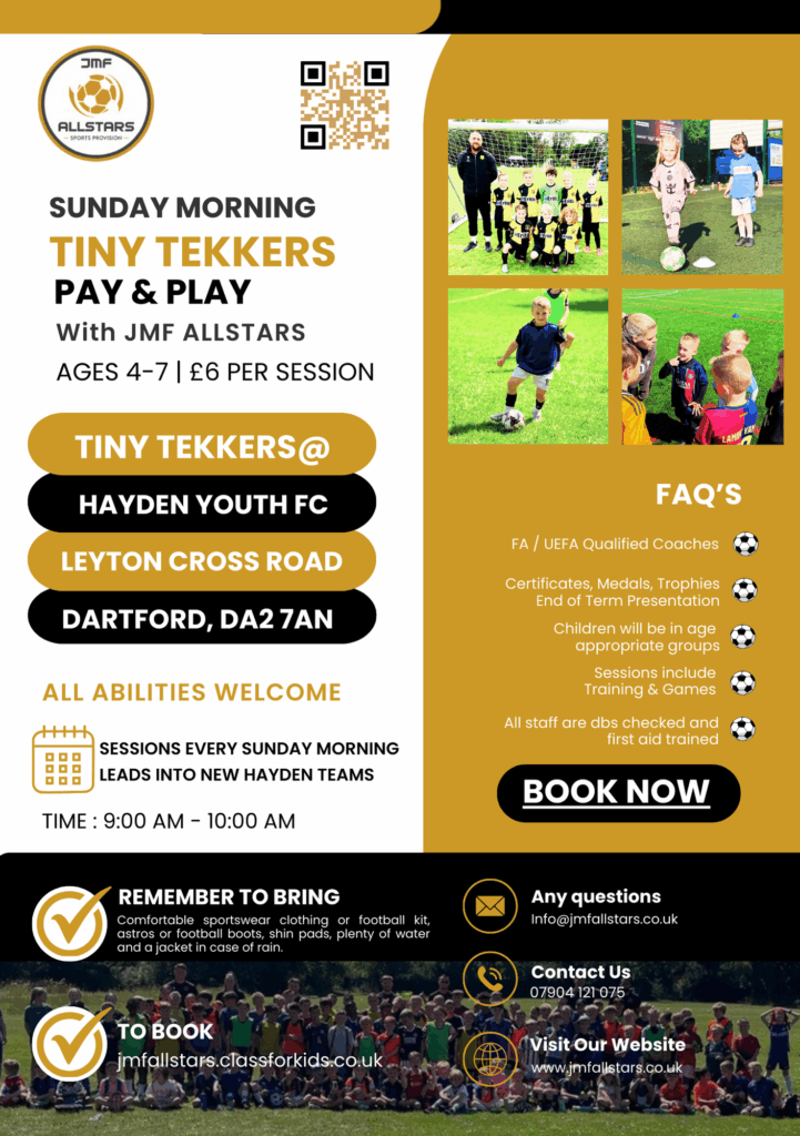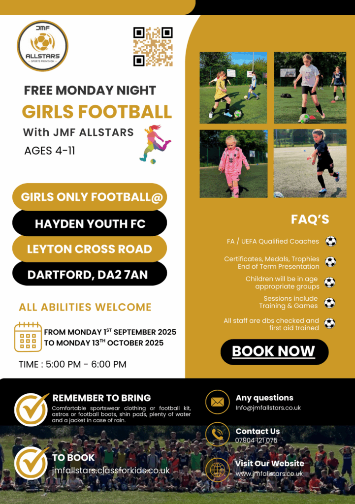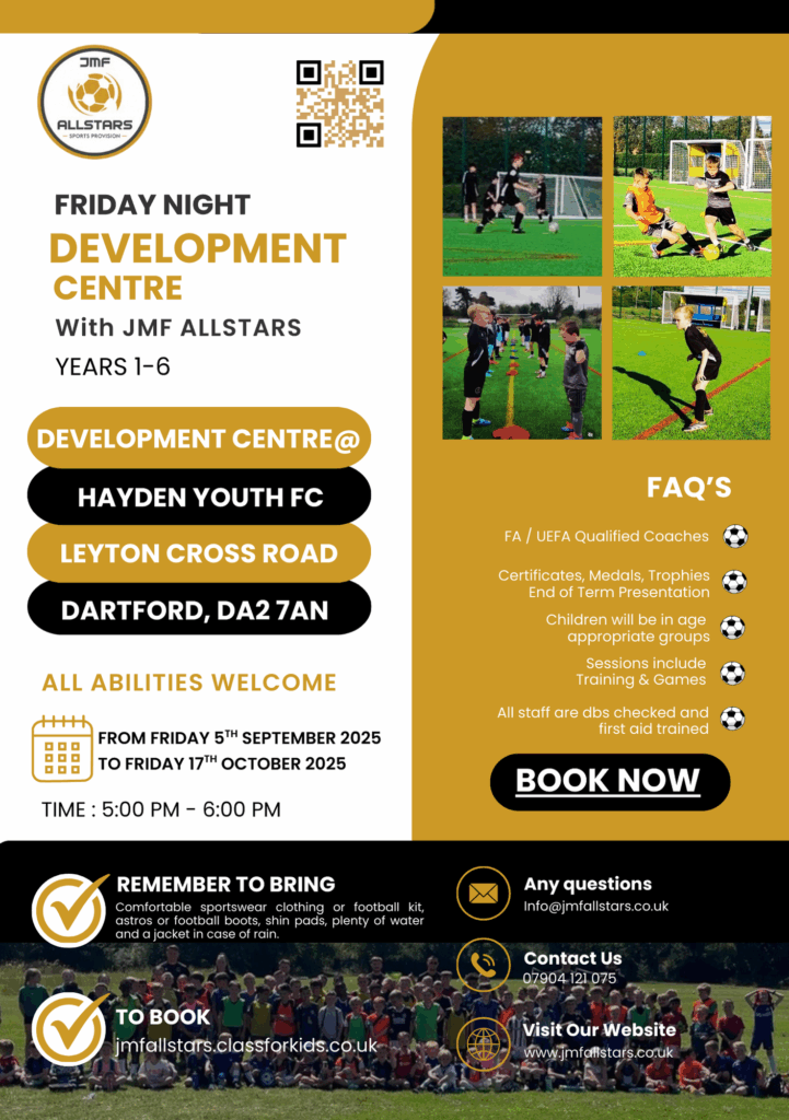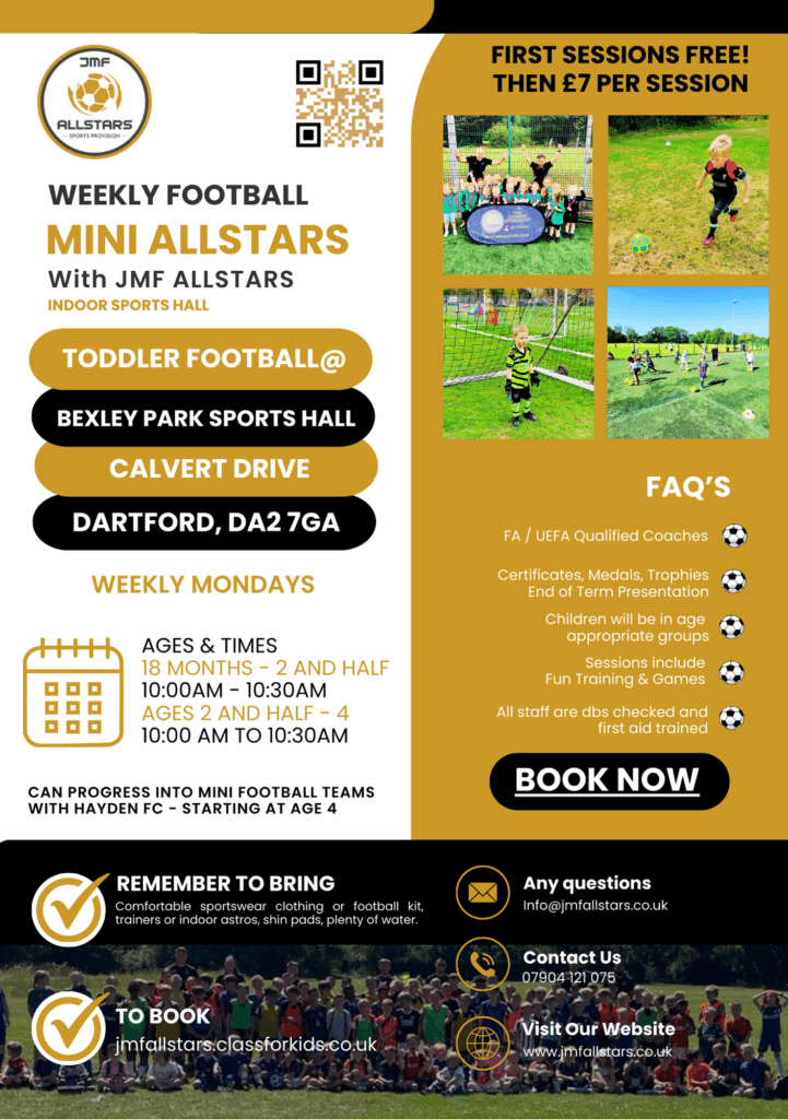 Welcome to our thrilling Evening & Weekend Football Activities at JMF Allstars! Get ready for action-packed evenings filled with all things football. Our main focus is on providing top-notch football training and games, perfect for players of all skill levels. Whether you’re a budding football star or just looking to have a kickabout with friends, our evening sessions have something special for you. Led by our experienced and passionate coaches, you’ll receive expert guidance to improve your technique, teamwork, and overall game. It’s not just about training; it’s about having a blast on the field, making memories, and fostering a love for the beautiful game. Join us for some unforgettable football evenings that will leave you energised and excited for more. Come on down to JMF Allstars and let’s score some goals together!